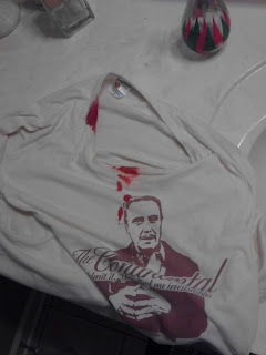 This is a surprising amount of blood for me to have had absolutely no clue that I was cut or how it had happened. Obviously, I had angered some deity. The blood god demanded a sacrifice, and only Greg brand Sangria would slake Quetzalcoatl's thirst. That, or The Walken was angered that I wore his graven image, and his fury knew no bounds.